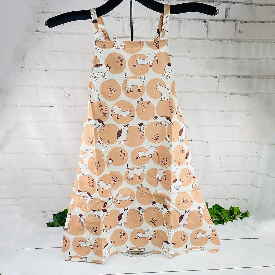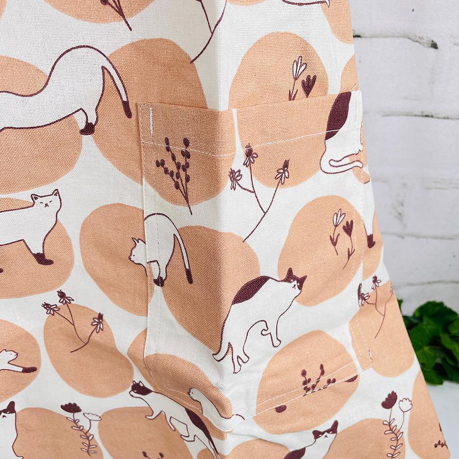 いろいろな猫のイラストが描かれたとってもかわいいエプロンです。大きなポケットもついていて使い勝手も良い。インド綿を使用していて吸水性にも優れいています。