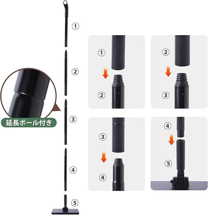 「長さ調整可能」:フロアワイパーは、掃除の場所によって組み立てられるパイプの本数を変え、柄の長さを調整することができます。