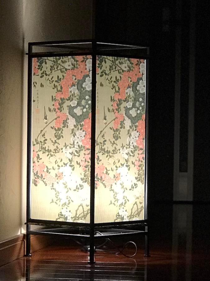 日本の画家の作品をシェードに取り入れたフロアースタンドです。サイズ 幅260、奥行き260、高さ600mm 重量 5KG 材質 鉄 焼付塗装 艶なしLED電球使用