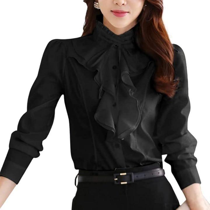 胸元のフリルと大きめのリボンが印象的な長袖のフリルブラウス。