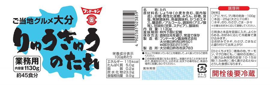 「りゅうきゅう」とは、もともとは漁師たちが獲れた魚を保存するために作っていた漁師飯です。さば、あじ、ぶり、鯛などの切り身に特製の甘口しょうゆたれをかけた『大分流海鮮づけ』です。【りゅうきゅうのたれのじだわり1九州の基本"甘口"・・・本醸造こいくちしょうゆをベースに、甘めの味付けに仕立てています。2本みりんと料理酒・・・みりんと料理酒をバランス良く配合し、魚の生臭みを消します。【調理方法】刺身100gに足対して本品大さじ1と1/2を目安にご使用下さい。15分程漬け込むとねっとりした食感になります。クセのないすっきりとした醤油を使用することで、より素材の風味を引き立たせています。業務用りゅうきゅうのたれを製造しているフンドーキン本社工場では大分が発信源であるゆず胡椒、かぼすぽん酢を中心に二百七十種類の調味料を製造しています。調味料の大切な味の要となるのがゆず、かぼすなどの農作物。当社では複数の生産地のものをブレンドすることで、ブレのない安定した製品を供給しています。フンドーキン醤油の社名の由来とロゴマーク・・・ロゴマークのデザインはかつて目方を量る際に使用した【錘(すい)はかり・おもりのこと】の形を基にデザインされました。【確かさ・正義】をあらわし、中央に初代創始者小手川金次郎の【金】をあしらっています。裏表がなく左右対称であることから製品の確かさや、偽りのないことを意味しています。社名も同様に、裏表がなく確かな【分銅(フンドウ)】に創始者の小手川金次郎の【金(キン)】をつないで、フンドーキンと名づけられました。