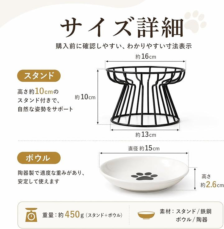 「使いやすい仕様」スタンド約16x16x10cm、ボウル直径約15cm・高さ約2.6cm、重量約450g。
