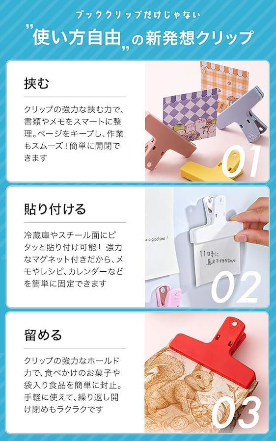メモや封止めにも使える多用途設計」厚みのある本のページ固定はもちろん、ちょっとしたメモやレシピ、学校からのお知らせ、さらには食品袋などの封も簡単にとめることが可能。