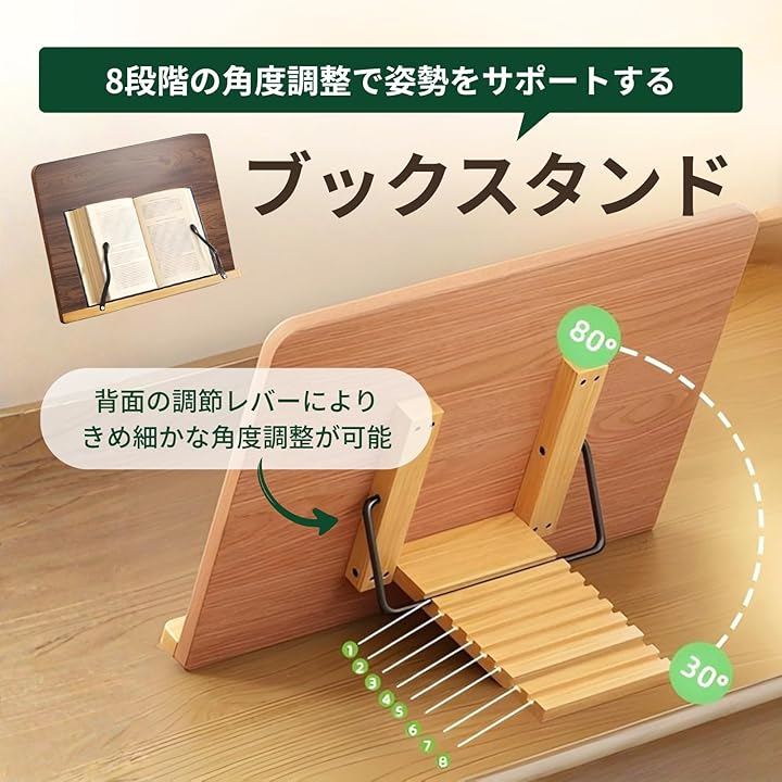 視線に合わせて最適な角度に設定できるため、長時間の読書や勉強による首・肩への負担を軽減し、正しい姿勢を維持します。