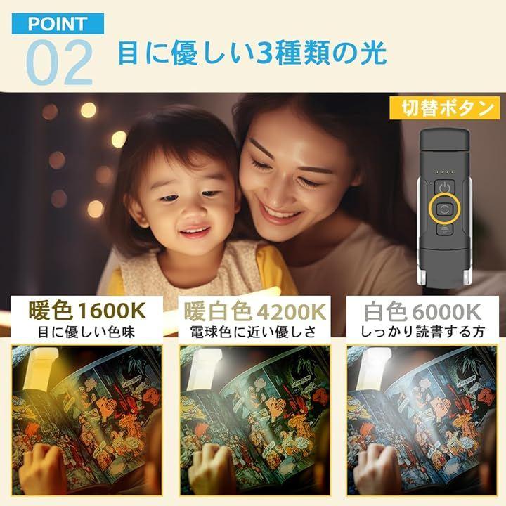 「目にやさしい3種類の光」 暖色(1800K) : 目に優しい読書モード *ブルーライト99.9%カット 暖白色(3400K) : リラックス読書モード 白色(6000K) : 集中読書モード