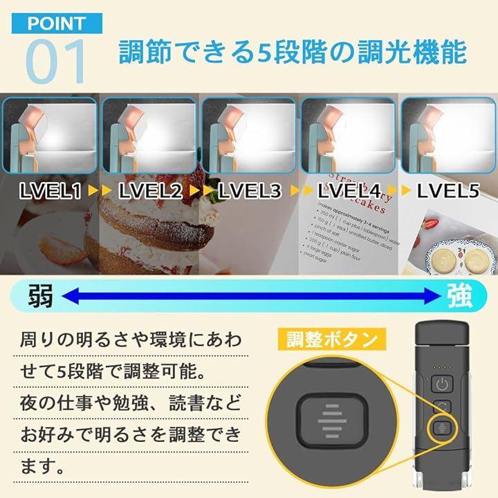 [5段階の明るさ調節可] この小型ブックライトは5段階の明るさがあり、目に合ったレベルを選択できます。