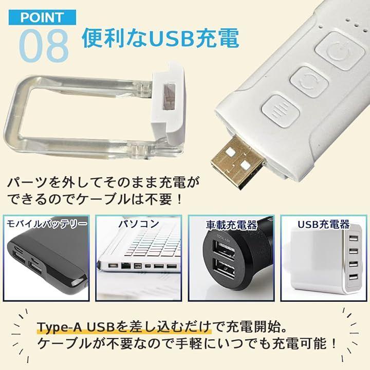 「便利なUSB充電」 汎用性の高いUSB Type-A ケーブル不要でキャップを外せば直接充電可能