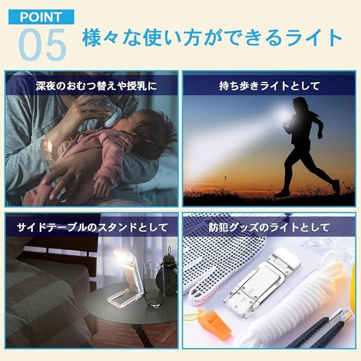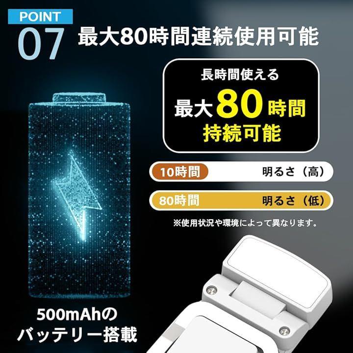 「最大80時間連続使用可能」 10時間~最大約80時間点灯 *明るさの設定により異なります 500mAhバッテリー内蔵