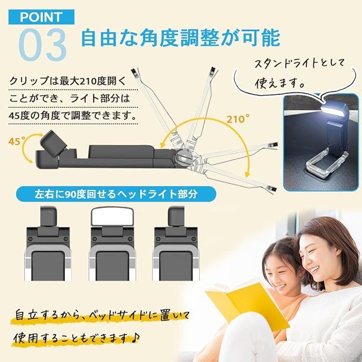 「自由な角度調整」 クリップは最大210°開く事ができます ライト部分は45°の角度で調整可能 自立もするからスタンドとしても使用可能