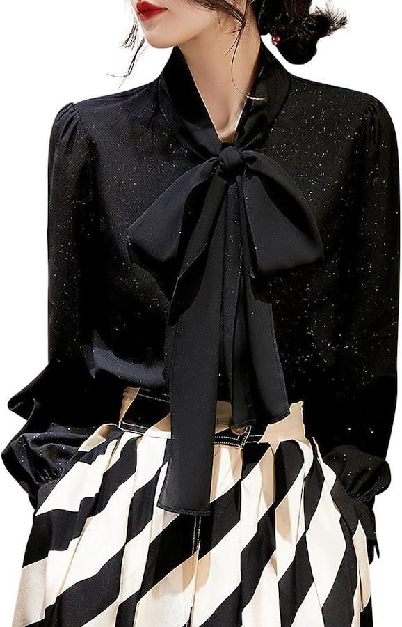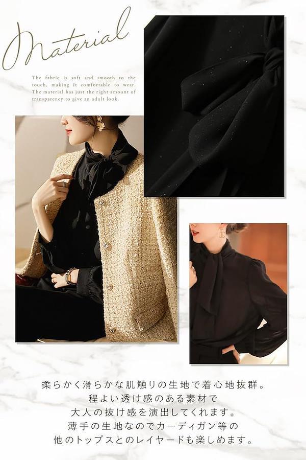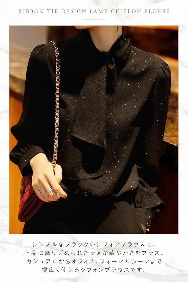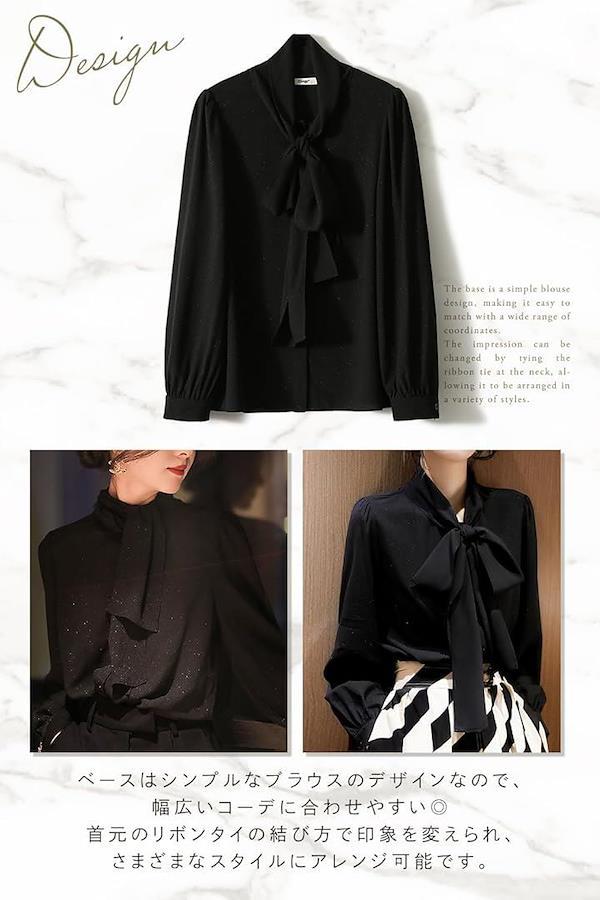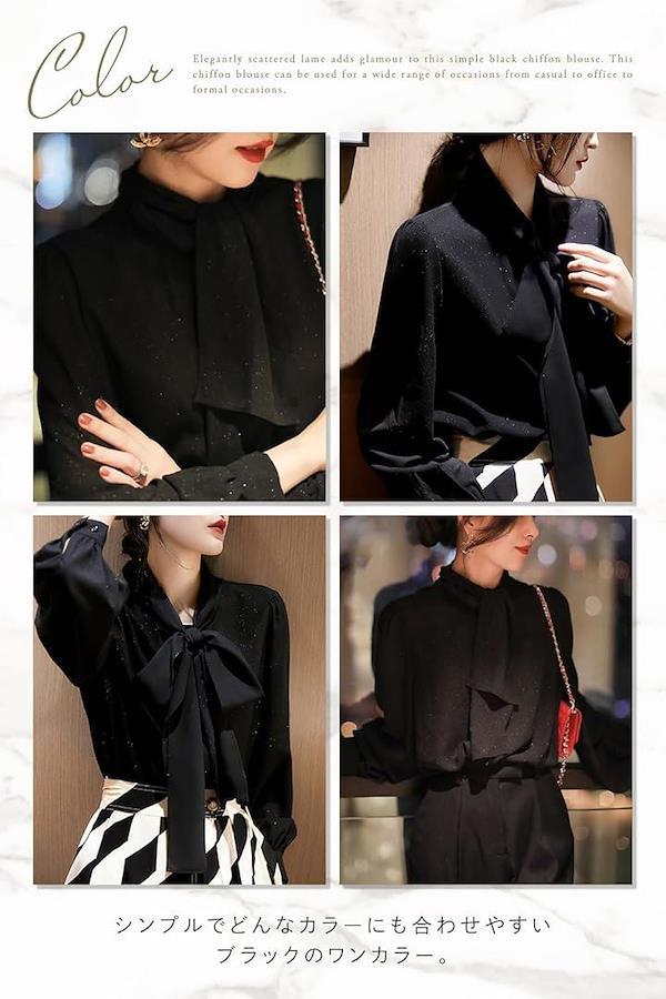 Blouse for women, long sleeve, office, chiffon, glitter, ribbon, black, elegant