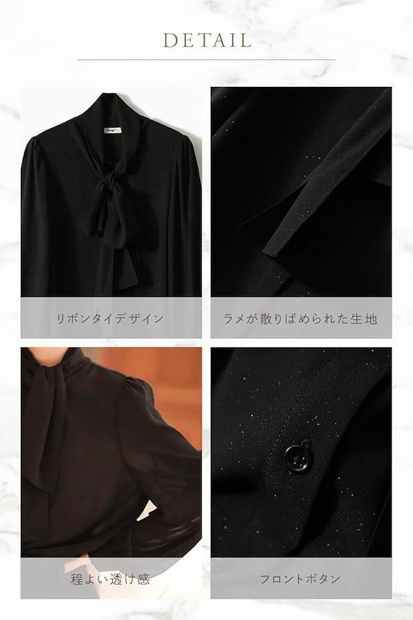 ポイント(1):女性らしさと優雅さを演出するラメシフォンブラウス。アレンジ自由なリボンタイデザインはさまざまなスタイルが楽しめます。