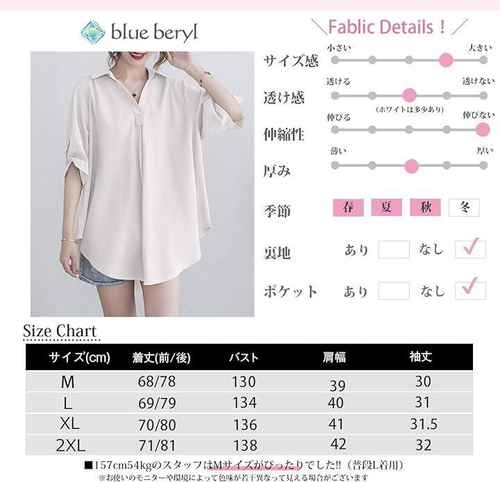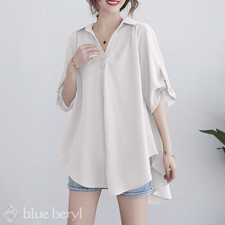 スキッパータイプの深めに空いた胸元が、Vカットを強調して顔周りをスッキリシャープに演出。