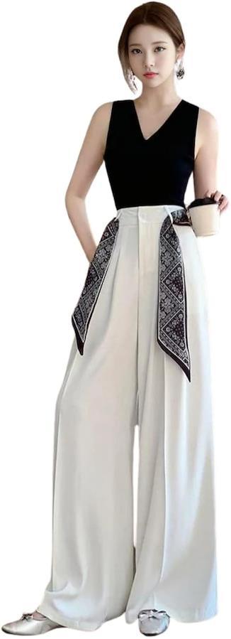 Blue Beryl Women's Wide-Leg Pants with Scarf Belt, High Waist, Draped, Stylish, Solid Color, Perfect for Everyday Wear, BB089-WH-L