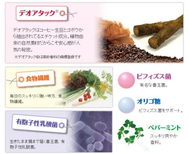 森林浴で一躍有名になったフィトンチットエキスや、植物由来の自然派素材デオアタックといったエチケット成分に加え、有胞子性乳酸菌にビフィズス菌、オリゴ糖を加えた3つの善玉菌、さらに現代の食生活では不足しがちとされる食物繊維と、7成分を配合。
