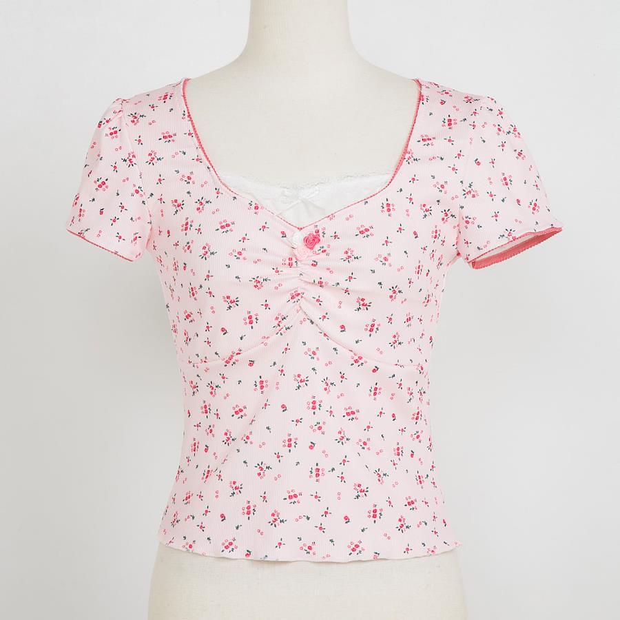 ◆Design小さなRose柄が施された細リブの半袖カットソートップスロマンティックな雰囲気バレエコアコーデにGOOD!細リブの素材感がほどよくボディラインにフィットし、上品で洗練されたシルエットを作り出します。胸元には花がついててチラ見せレースも本体についているので1枚で楽々コーデ。