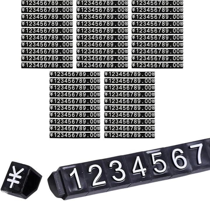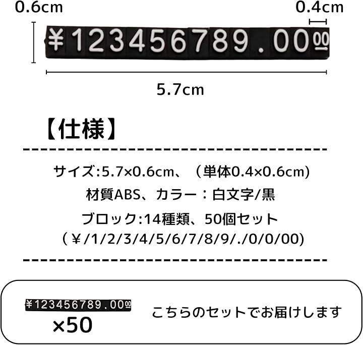 「仕様」サイズ:5.7x0.6cm、(単体0.4x0.6cm)、材質ABS、カラー:白文字/黒、ブロック:14種類、50個セット(¥/1/2/3/4/5/6/7/8/9/./0/0/00)