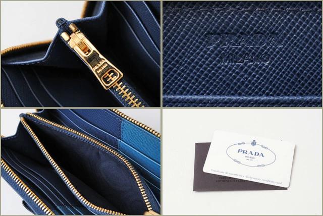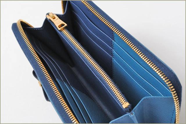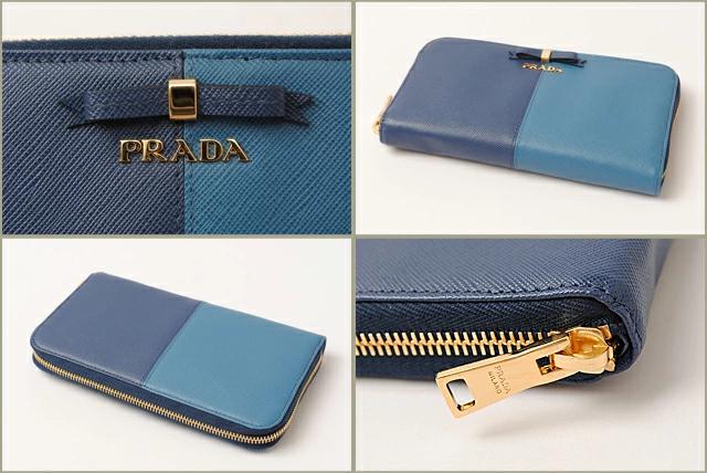 プラダより、機能的な長財布です。センターのリボンモチーフとPRADAのロゴを象ったメタルプレートがアクセントになり高級感があります。バイカラーとなっており、トーンの異なるブルー系のカラーリングが、さわやかな印象に。とっても機能性に優れたお財布で、ポケットがたくさんあり、充実の収納です。財布の中身が多くなりがちな方にもオススメ!