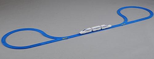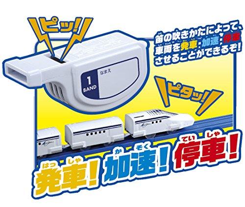 専用の笛でプラレールの動作をコントロールすることができます。笛の吹き方によって、停車・発車やスピードが変わります。レールセットの内容は現在走行試験を行っている山梨付近をイメージしており、直線が長くなっております。スイッチがOFFの時には手ころがし遊びも可能です。NEWシャーシに対応したボディを載せ替えることによって、いろいろな車両をコントロールできるようになります。(一部車両を除く)