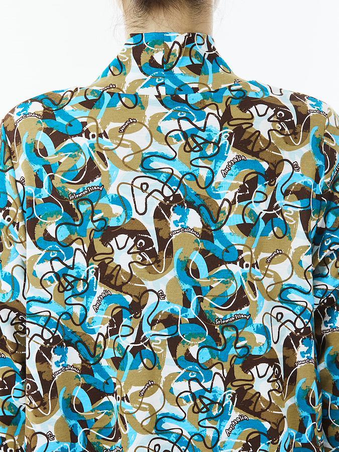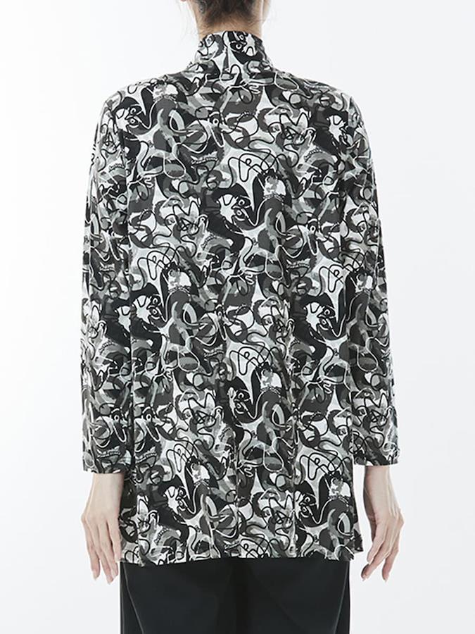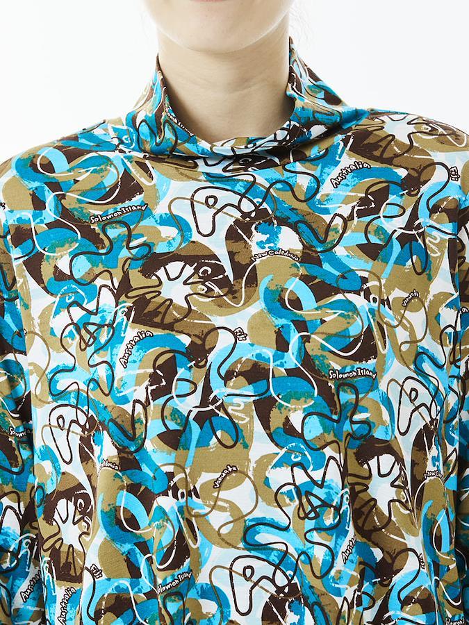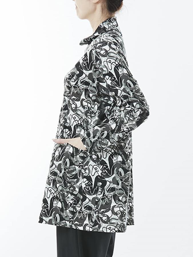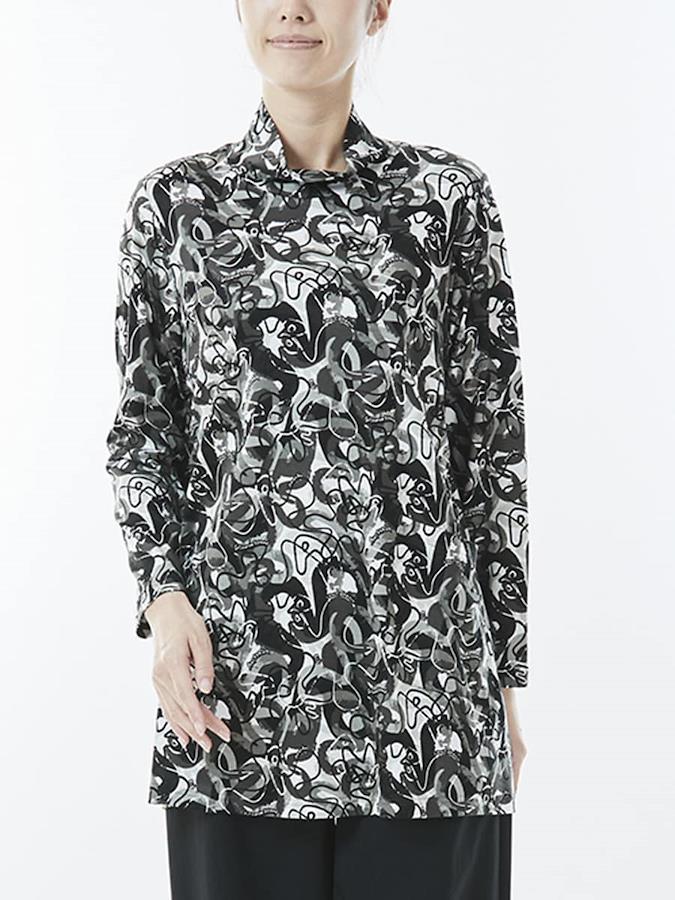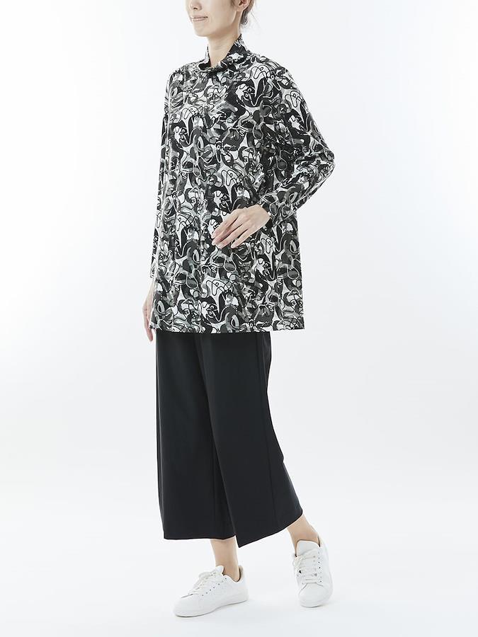 光沢感と適度なハリ感、ストレッチ性のあるポンチをプリント下に使用しています。 (size-40 肩幅38cm バスト110cm 袖丈56cm 着丈72cm) サイズは多少の個体差が生じる可能性があります