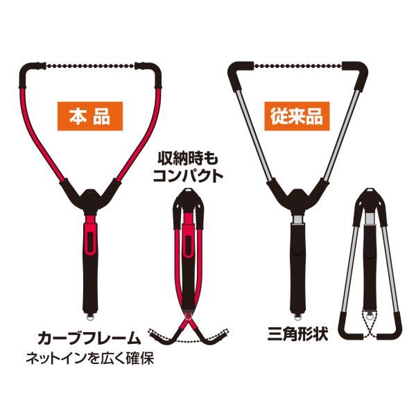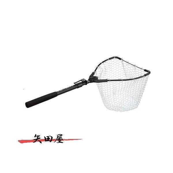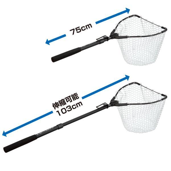 カーブフレームのコンパクトネット 片手で操作がスムーズにできるランディングネット。クロスフォールディング構造でコンパクトに収納された状態から振り上げるだけで素早くランディングポジションへ。収納時は、ロックレバーを引くと、ネットの自重でフレームが回転して閉じます。ハンディショートは、全長54cmの手だもタイプ。アルミフックハンガーでベルトなどへ装着でき、取り回しよく素早いランディングが可能。アジングなどに。アジャスターロングは、ランディングの状況に応じてアルミシャフトの長さを調節できる アジャスター機構。75~103cmの間で調整でき、ブラックバス・トラウトなどにも対応。ネットはラバーとラバーコードから選べる。カーブフレームでネットインを広く確保。携帯に便利なアルミフックハンガー付き。ネットタイプ:アジャスターロング ネットタイプ:ラバー ネットカラー:クリア枠カラー:ブラック枠サイズ(cm):30×28全長(cm):75~103収納時(cm):48 画