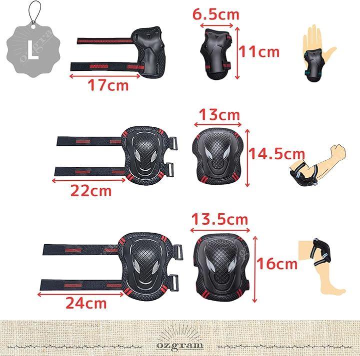 「Lサイズ」 *ハンドガード 6.5x11cm ストラップ:17cm *エルボーガード 13x14.5cm ストラップ:22cm *ニーガード 13.5x16cm ストラップ:24cm