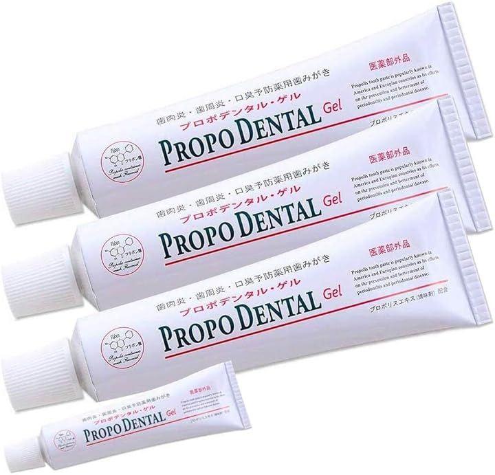 内容量:プロポデンタル・ゲル1本75gx3本+ゲル・ミニサイズ8g 1本プレゼント。 高濃度プロポリスエキス、2種類の薬用成分とキシリトール、甘草エキスを配合したジェルタイプの薬用歯磨きです。