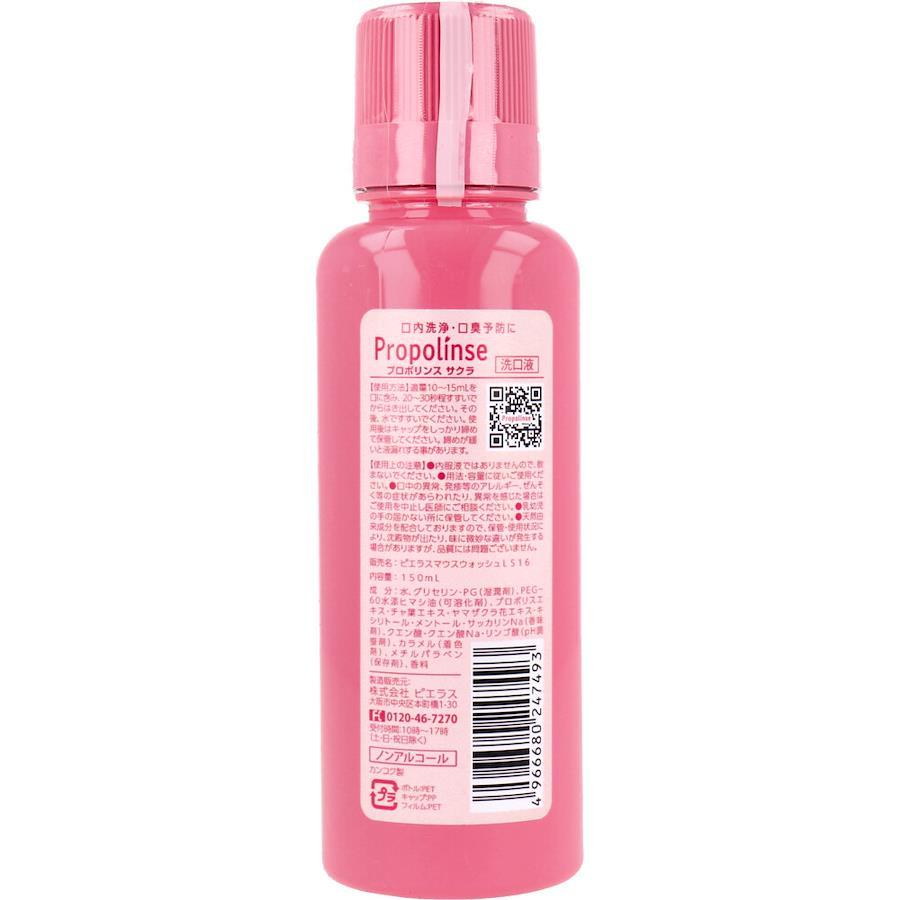 口内洗浄・口臭予防に♪マウスウォッシュ習慣を始めましょう!20秒で完了、快適口内ウォッシング!●プラスワンステップ!お口の快適習慣を身につけよう!ハミガキの前後や、食事の後、寝る前などに、20~30秒くちゅくちゅして吐き出すだけのカンタンワンステップで、口臭の元や口の中の汚れをプロポリンスでキレイに洗い流して、お口の快適環境をゲット!●たまった口臭の元が!海苔の佃煮!?違います!これがあなたのお口の状態なんです!こんな固まりがどっさり出てきます!使用後は歯の裏側までツルツルになる爽快感を実感してください!※口の中の状態によって出てくる量は違います。●お口にうれしい成分をしっかり配合。口腔内のタンパク質などと結合する製法をはじめ、天然由来成分プロポリスエキス、リンゴ酸、やさしくケアするキシリトールなど、歯とお口うれしい成分をしっかり配合。●いつでもどこでも、お口のエチケット「ニオイがちょっと気になるかも」そう思った時にプロポリンス。朝起きた時、食事の後、またワインやコーヒーのような、色の濃いものを口にした後など、1日の様々なシーンで。おやすみ前にお使い頂くと、朝起きた時のお口のベタツキ感が違うのを実感できてオススメ!●ほんのり甘い「桜フレーバー」&刺激ひかえめのノンアルコールタイプ。