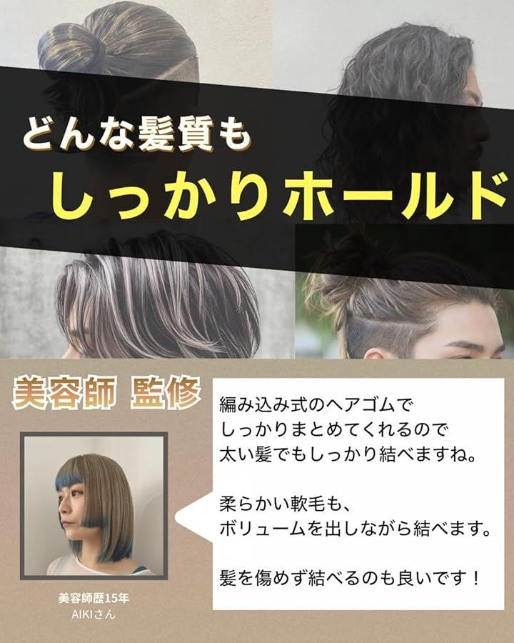 「どんな髪質でもしっかり留まる 髪ゴム(男性 にオススメ)」 直径 約 6.0cmの太いヘアゴムが、太くてしっかりした髪も まとめづらい軟毛もしっかり結べる。 ジャージ素材を編んでいるので、伸縮性に優れています。