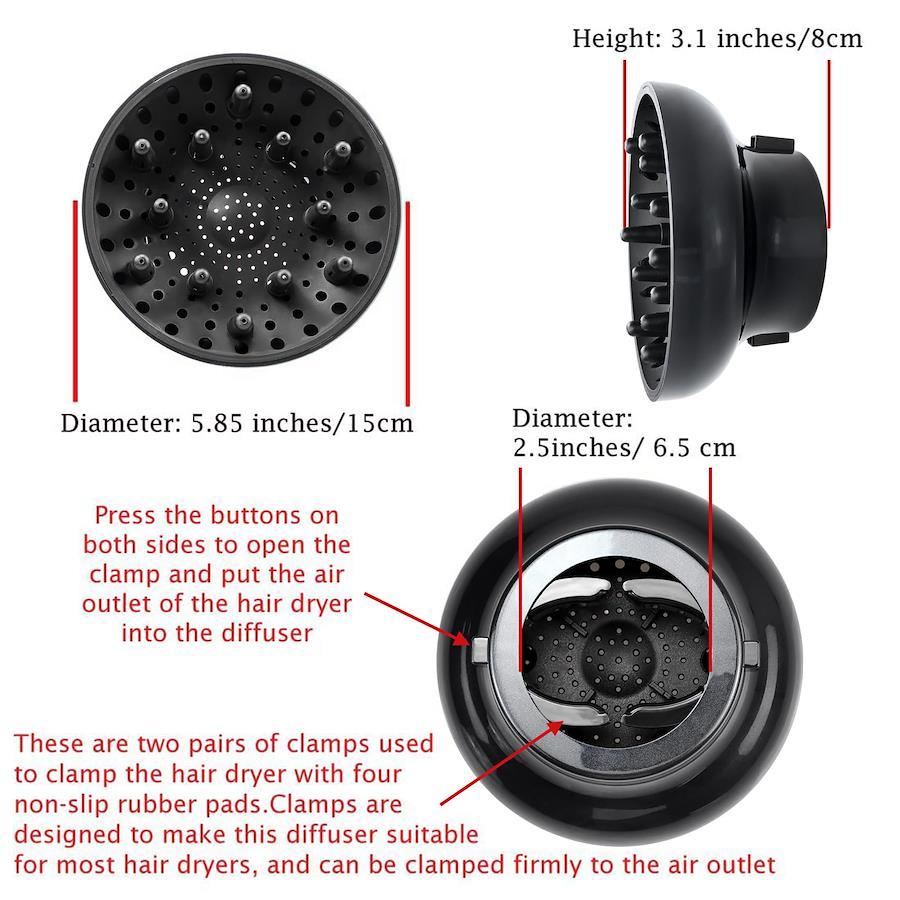 ヘアドライヤーユニバーサルディフューザー:このディフューザーは、ほとんどのタイプのヘアドライヤーに適しています。 ヘアドライヤーの吹き出し口の直径は4?7cmで揃えることができ、吹き出し口が不揃いでも使用可能プロフェッショナルヘアードライヤーディフューザー:突起のある大きなお椀型のディフューザーです。巻き髪がぐちゃぐちゃにならないように使用してください。同時に、ヘアドライヤーからの風を分散させ、ディフューザーに配置されたカールがすばやく乾燥し、ヘアドライヤーの髪へのダメージを軽減します。乾いた毛根のディフューザー:ボウルの突起が根の皮膚に当たると、毛髪の根元をすばやく乾かし、ヘッドマッサージにも使用できます。これは巻き毛だけでなく、すべての長い髪に必要です髪を