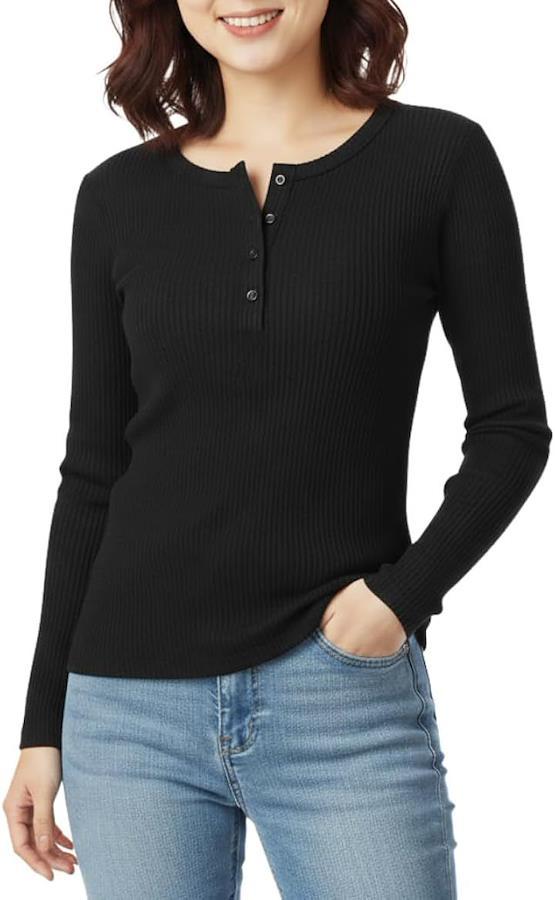 デコルテ美人を演出するヘンリーネックと、細見えリブでスタイルアップ。
