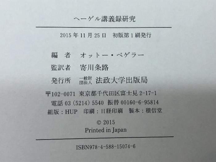 商品名:ヘーゲル講義録研究 法政大学出版局 オットー・ペゲラー