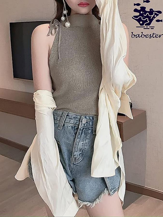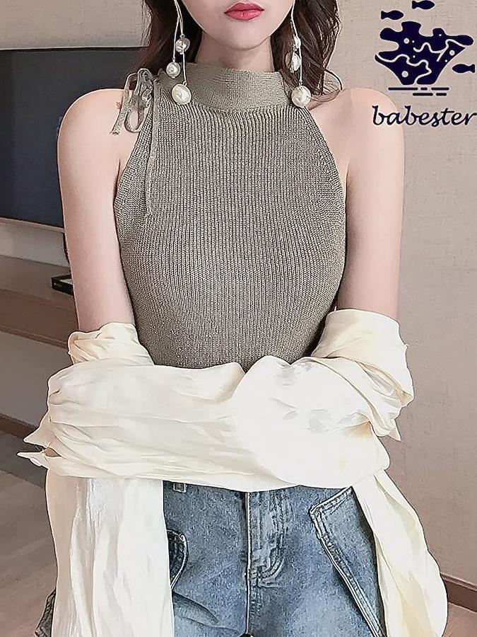 Babe Star Women's Sleeveless Knit Halter Neck American Sleeve Ribbon F