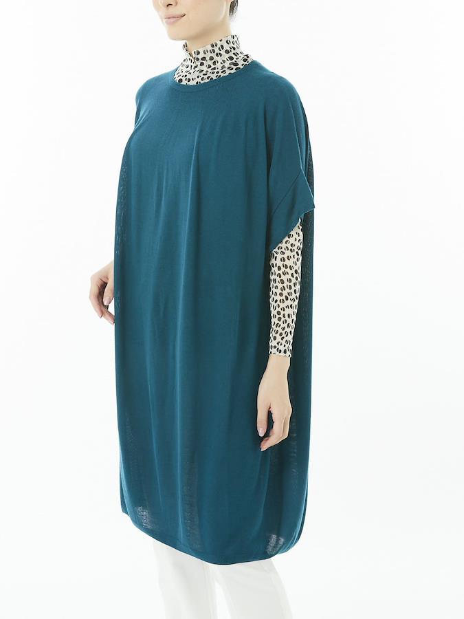 レーヨンの柔らかさと、シルクの光沢感が特長のニットワンピース。落ち感もよく、インナーによって、JUSTから秋まで着られる、リラックスした着心地の良いベスト風ワンピースです。(size-40 バスト152cm ゆき丈45cm 着丈90cm 裾まわり127cm) サイズは多少の個体差が生じる可能性があります