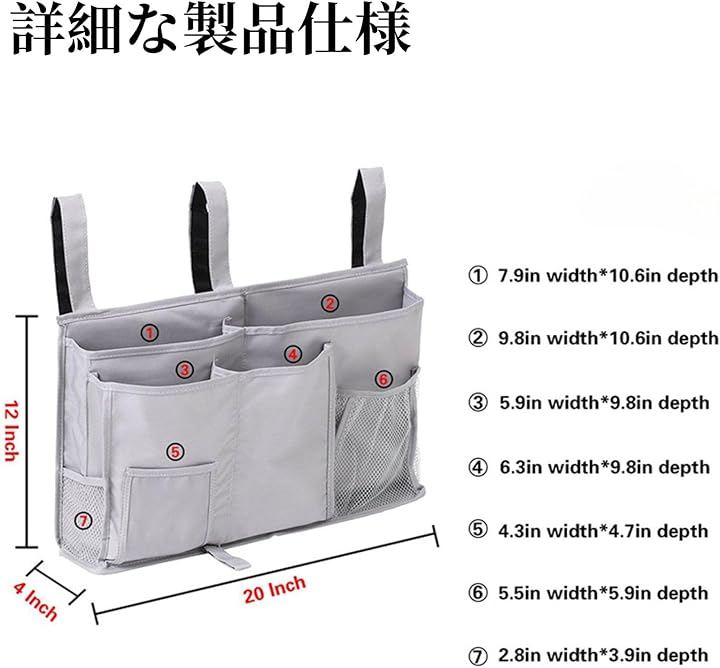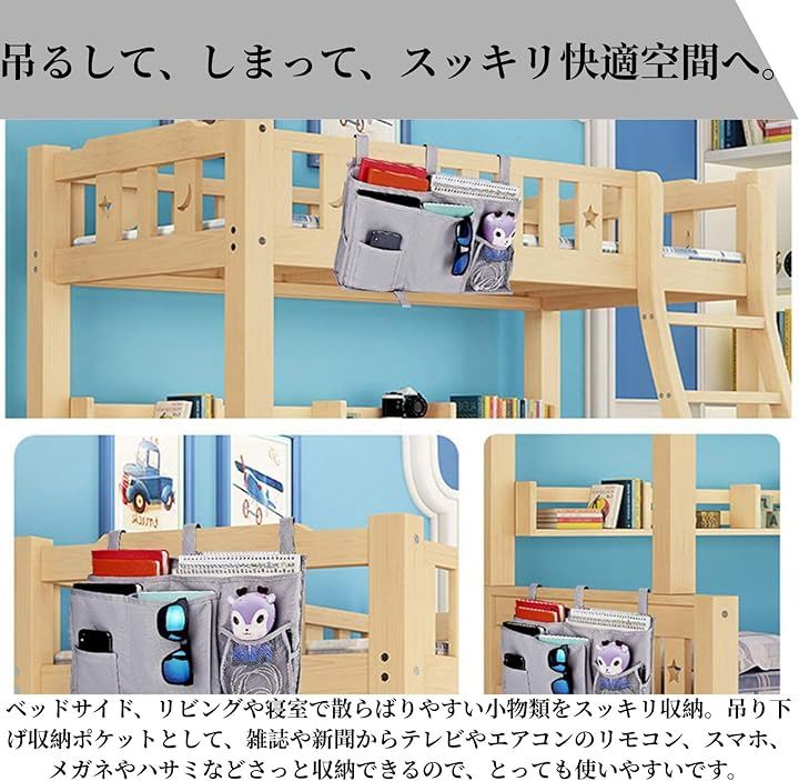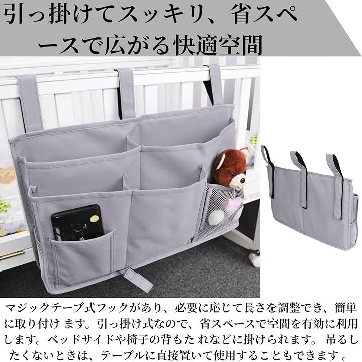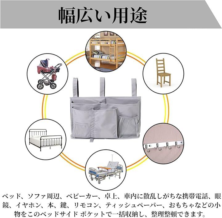 「幅広い用途」:ベッド、ソファ周辺、ベビーカー、卓上、車内に散乱しがちな携帯電話、眼鏡、イヤホン、本、鍵、リモコン、ティッシュペーパー、おもちゃなどの小物をこのベッドサイド ポケットで一括収納し、整理整頓できます