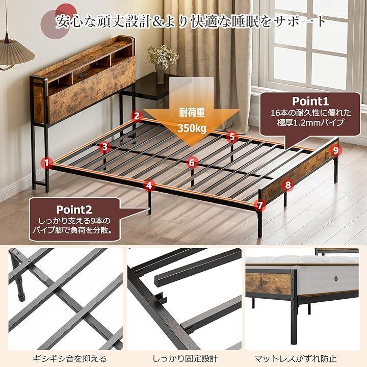 「350kgの耐荷重。 圧倒的な耐久性と驚異の安定感」ベッドフレームは16本の高強度スチール製フレームと9本の太く頑丈なサポート脚を組み合わせた構造に加え、接合部の金具一つひとつまで強化を追求。