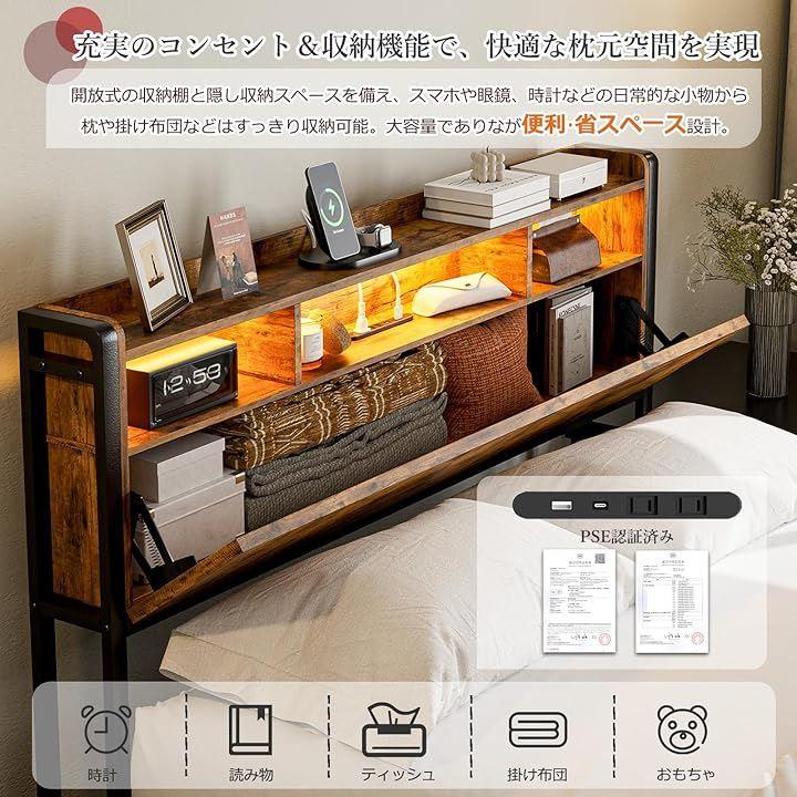 「充実のコンセント&収納機能で、快適な枕元空間を実現」開放式の収納棚と大容量の隠し収納スペースを備え、スマホや眼鏡、時計などの日常的な小物はすぐ手に取れる場所に。