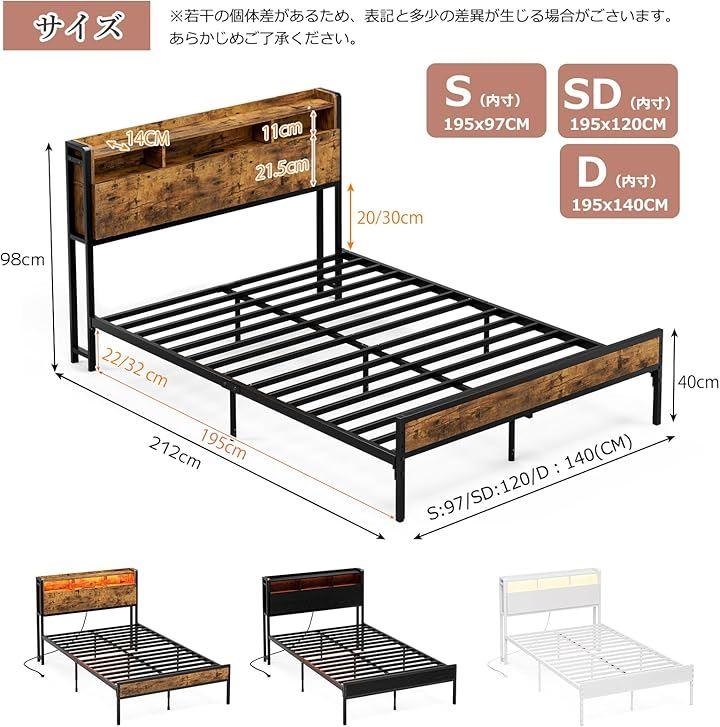 「商品仕様」*商品サイズ(cm):幅97x奥行212x高さ98cm *商品重量:約26kg *梱包サイズ:105.5x34x17.5CM *梱包重量:28kg *材質:本体/スチール(粉体塗装)棚板/MDF *対応マットレスサイズ:シングルサイズ(幅97x長さ195cm) *耐荷重:本体/約350kg ヘッド部棚/約20kg *カラー:ブラック/ホワイト/ビンテージ 組立品/完成品:組立品(2人で組立て時間約45分)。
