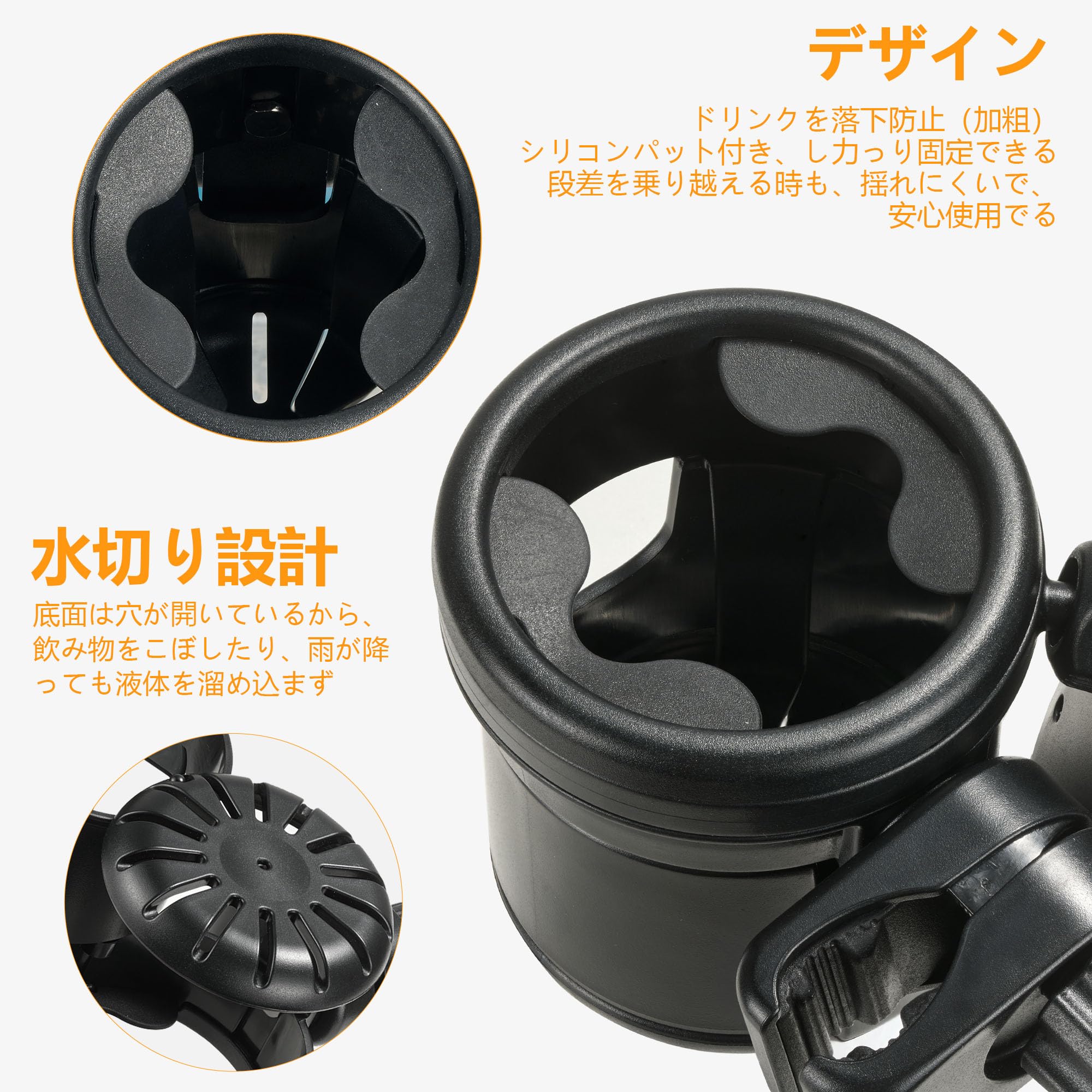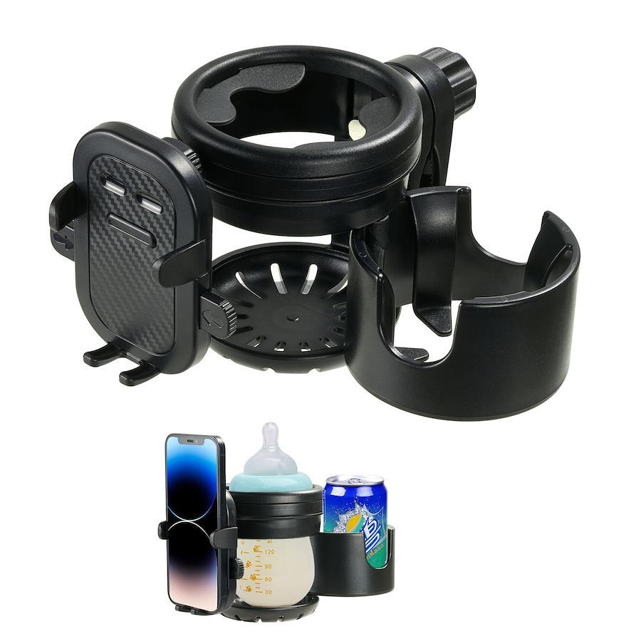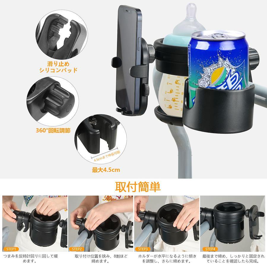 【素材&仕様】ドリンクホルダーの素材は環境に優しい無害な高品質のABS樹脂素材なので、赤ちゃんにも安心です。軽量でありながら十分な強度があるため、耐久性にも優れています。取り付け部分は直径23㎜~40㎜まで対応可能です。各種バギー、ベビーカー、自転車、マウンテンバイク、トロリー、車椅子に取り付け可能です。 【3-IN-1&便利な】ベビーカー ドリンクホルダー にはメインホルダーとサブホルダーがあり、2つのドリンクを置くことができます。使わない時は1つに収納です。スマホスタンドもあり、移動中もスマホを自由に使えます。3-IN-1の機能で、ベビーカーを押しながら飲み物やスマホを出し入れする手間も省け、便利です。お出かけをもっと楽しくする必需品です。 【安定性&滑り止め】ベビーカードリンクホルダーのクリップ部には柔らかいシリコン素材が覆われており、ベビーカー本体を傷つけることはありません。ホルダーの内側にゴムのマットついているので、ドリンクが飛び出さないです。ガタガタの道でも使ってもズレることなく、安定感抜群です。 【取付簡単】 ドリンクホルダーは工具を不要、クリップで挟みネジで締めるだけで、ベビーカーのハンドルに固定できます。ホルダーは左右にスライド&360度回転するので、ベビーカーにお好きな位置でご使用いただけます。簡単な取り付けと便利な調整、太い丸棒、細い丸棒、平棒が適用します。注意:取り付ける際には、クリップのネジを緩めすぎないようにしてください。ネジが緩んだ場合、パーツが落下し紛失する可能性があります。 【多用途】このドリンクホルダーは、ほとんどのベビーカー・車椅子・自転車・デスクなどに使えます。直径約5.0~7.5cmまでの哺乳瓶、マグカップ、缶ジュースの細缶・太缶、ペットボトル、コンビニコーヒーなどに対応しておりご利用頂けます。スマホホルダーもついているので、地図アプリ、買い物の時のクーポンの提示など移動中にもスマホを自由に使えます。
