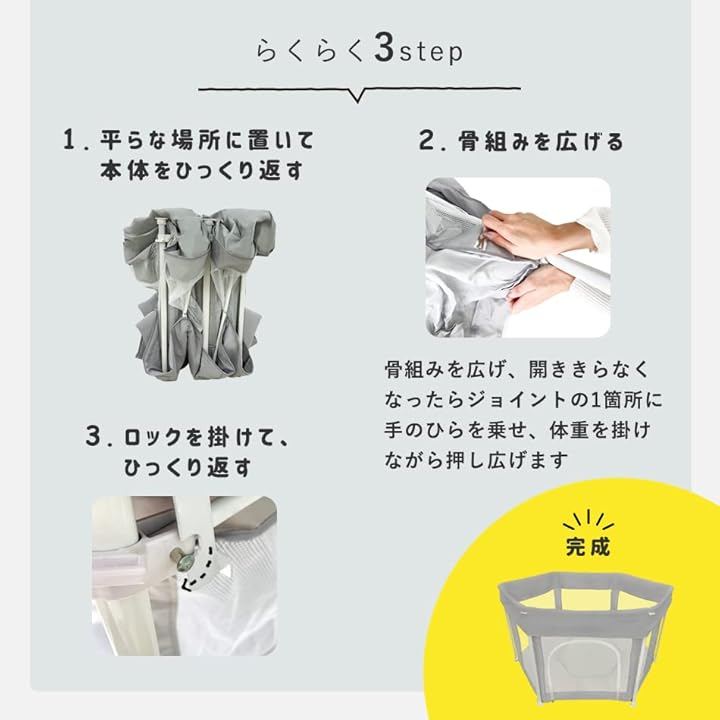 「簡単に設置ができるベビーサークル」広げてロック。工具不要。簡単2stepでお好きな場所に設置できます。