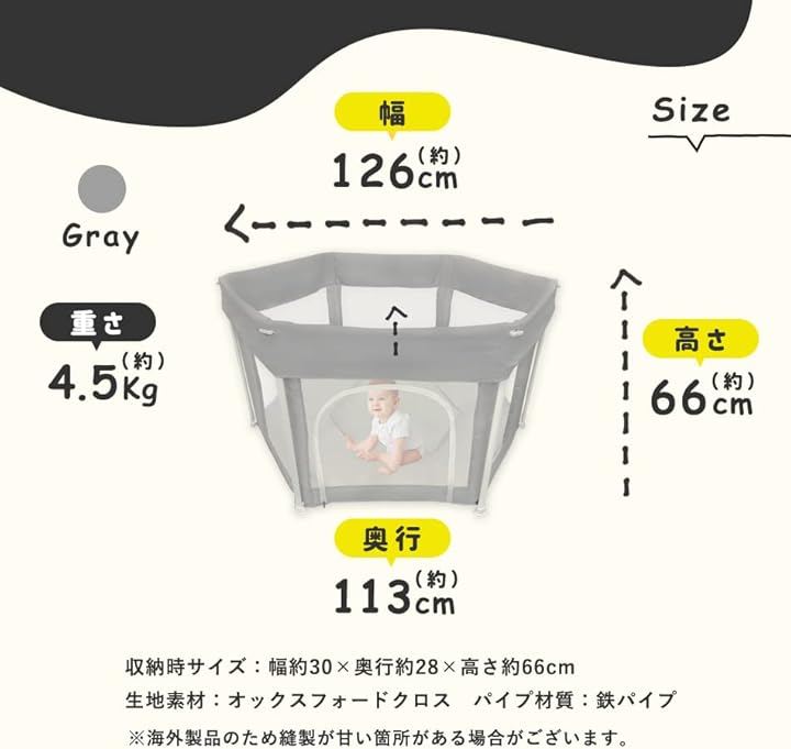 「製品仕様」本体サイズ:「使用時」幅約126x奥行約113x高さ約66cm「収納時」幅約30x奥行28x高さ約66cm(布がはみ出た部分は含みません)、本体重量:4.5kg、耐荷重:40kd、カラー:グレー、素材:オックスフォードクロス、鉄パイプ *生産は海外で行っており、糸のほつれ、細かいキズ、多少の汚れ、多少の匂い、外箱の傷等がある場合がございます。