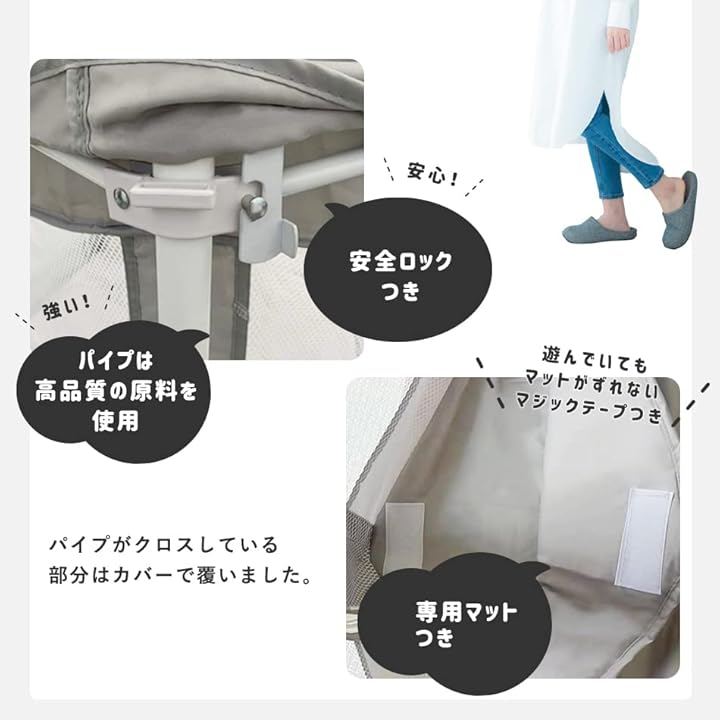 「衛生的にお使いいただけます」ベビーサークルのカバーとマットは取り外し後洗濯が可能です。