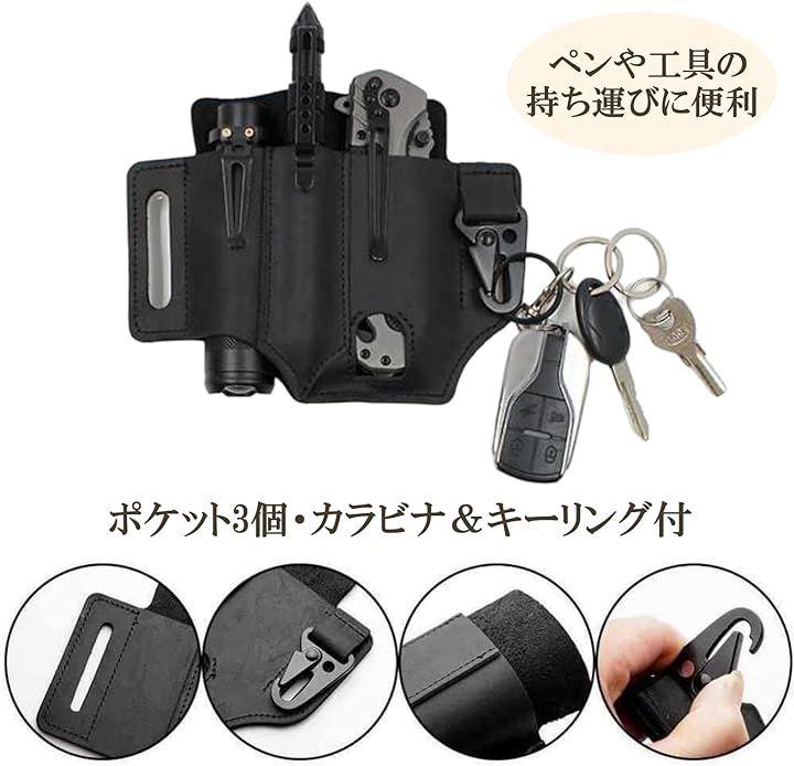 筆記用具や工具などスリムな物を差し込めるポケットが3つと鍵などを装着できるカラビナ付き。