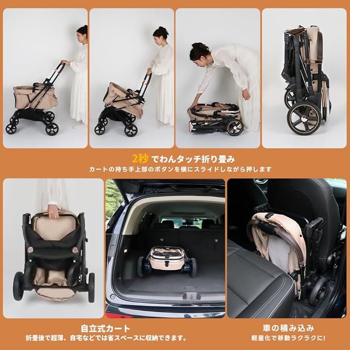 ワンタッチで折りたたんで3秒だけで収納完了、ハンドル調整収納も簡単でバッグと一体化の折り畳みも実現、移動しやすく場所も取らないです、車内に詰め込んで旅行用としても最適。背面ポケットとバスケットも付き、小物やおもちゃ、お手入れ用品、おやつなどが簡単に収納可能、お散歩や買い物の際にも役に立てるペットカートです。