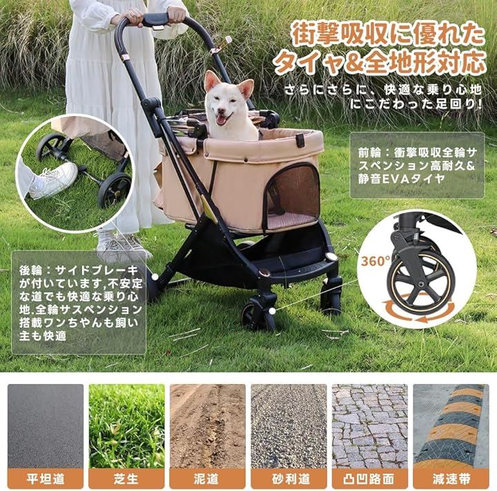 「安定性抜群」犬用カートは耐摩耗耐滑加工の高品質タイヤ、前後輪ともサスペンションを搭載、更に後輪には精密な二重軸受を装備し、丈夫で障害物を越えやすく、優れた振動吸収効果を発揮します。