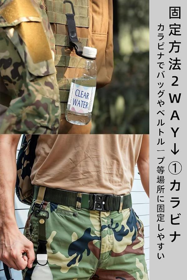 「固定方法2WAY」固定方法2WAYのペットボトルホルダーです。(1)カラビナでバッグやベルトループなど様々な場所に固定できます。