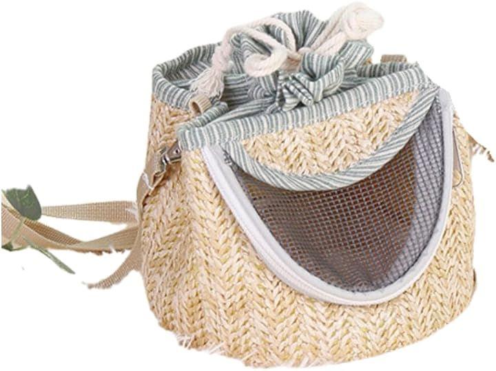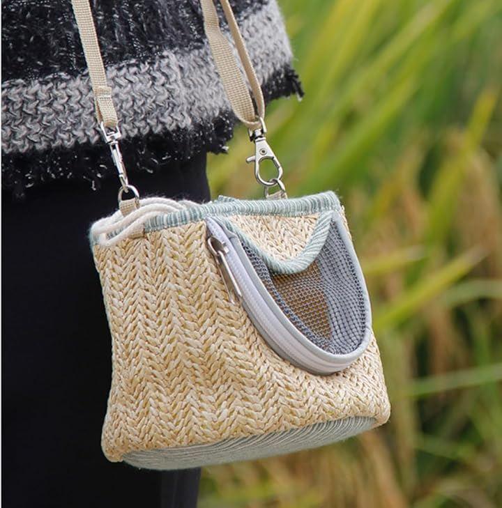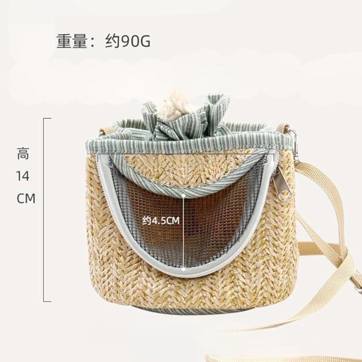 「仕様1:見た目と実用性を兼ねたデザイン」涼しげな印象の編み込み風素材をベースに、柔らかな布地を組み合わせたデザインが特徴の小動物用キャリー。