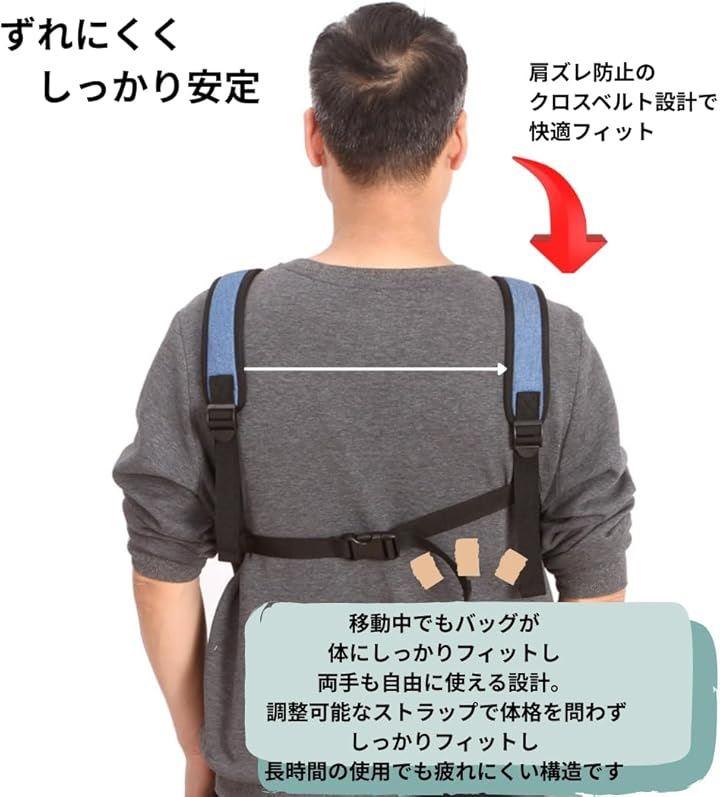 また、ショルダーベルトにはクッション性のある素材を内蔵し、肩への圧力を分散することで、使用中の負担を感じにくくする設計です。