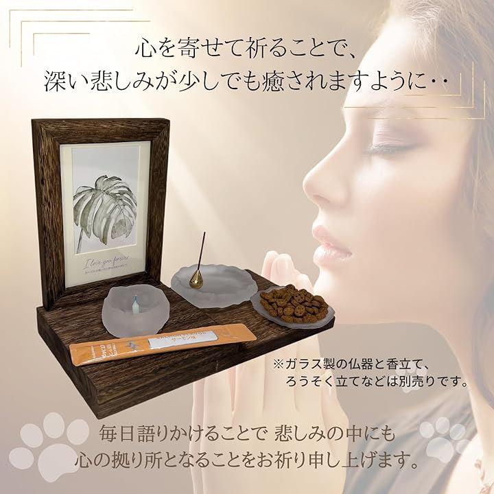 写真の横のスペースに骨壷や仏具、お供えを置いたり、思い出のお品を置くことも可能ですガラス製の仏器が3点と香立て、蝋燭たて 合計5点セットが付属します。