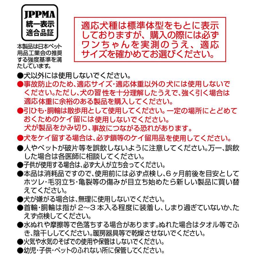 ●本品は犬用です。犬以外には使用しないでください。●本品を使用する際は、ドッグポール等のケイ留用品を使用してください。●本品は犬をつなぎ留めておくためのケイ留用です。ケイ留以外の用途に使用しないでください。●事故防止のため、適応体重以外の犬には使用しないでください。ただし、犬の習性を十分理解したうえで、強く引く場合は適応体重に余裕のある製品を購入してください。●使用前に必ずチェーンのねじれた部分を真っ直ぐに伸ばし、ねじれの無い状態で使用してください。●犬が嫌がる場合は、無理に使用しないでください。●かみぐせのある犬には使用しないでください。●子供が使用する場合は、必ず大人が立ち会ってください。●本品は消耗品ですので、使用前には必ず点検し、6ヶ月前後を目安として亀裂・サビ等が発生したら新しい製品に買い替えてください。●ケイ留場所を設定する際は、犬が動く範囲に障害物がないか確認してください。●火気や水気のそばでの使用や保管はしないでください。●幼児・子供・ペットのふれない所に保管してください。