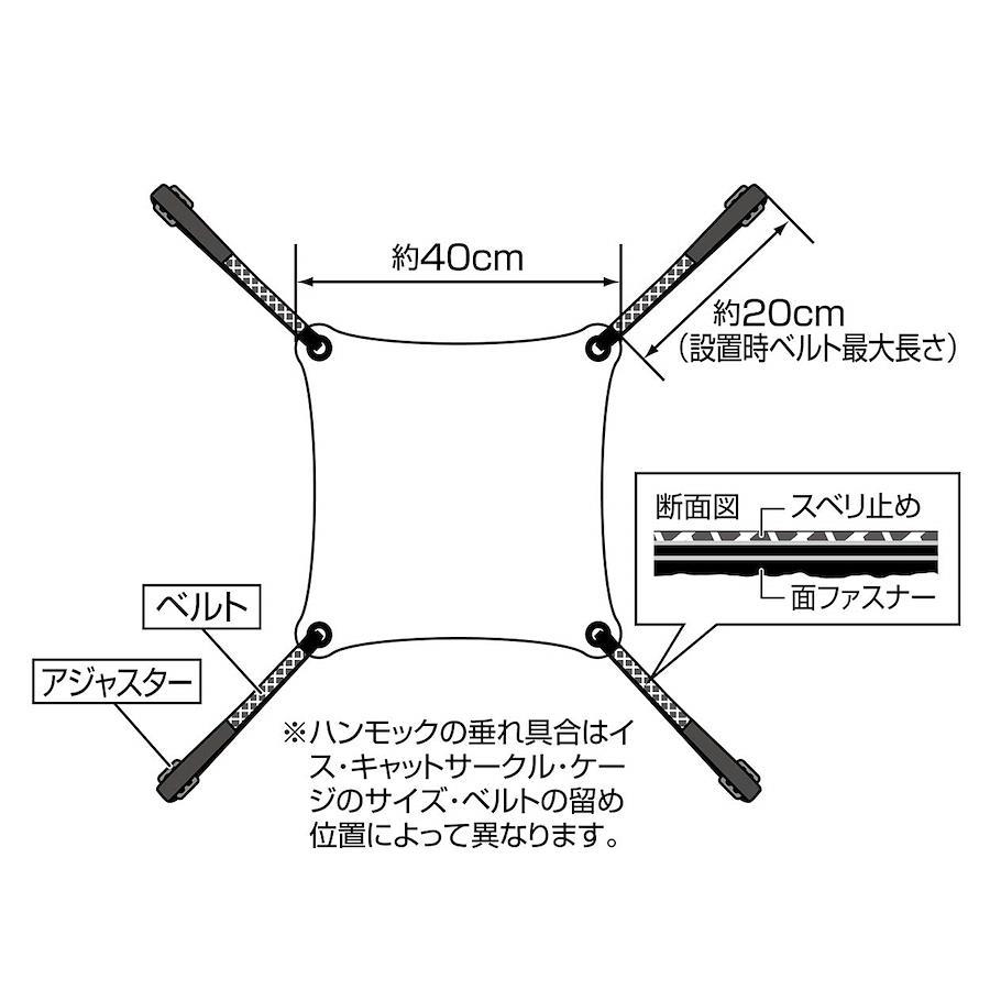 ※必ずベルトを4ヶ所取付け、ベルトが外れないか、スベり落ちないか確認をしてから使用してください。※ハンモックの垂れ具合はイス・キャットサークル・ケージのサイズ・ベルトの留め位置によって異なります。